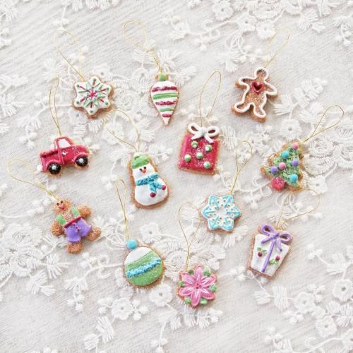 まるで本物のクッキーのような、可愛らしい指先サイズのオーナメント。アイシングのようなタッチで表現されたクリスマスツリーやプレゼント、おもちゃやジンジャーブレッドマンなど12種類のモチーフがセットになっています。