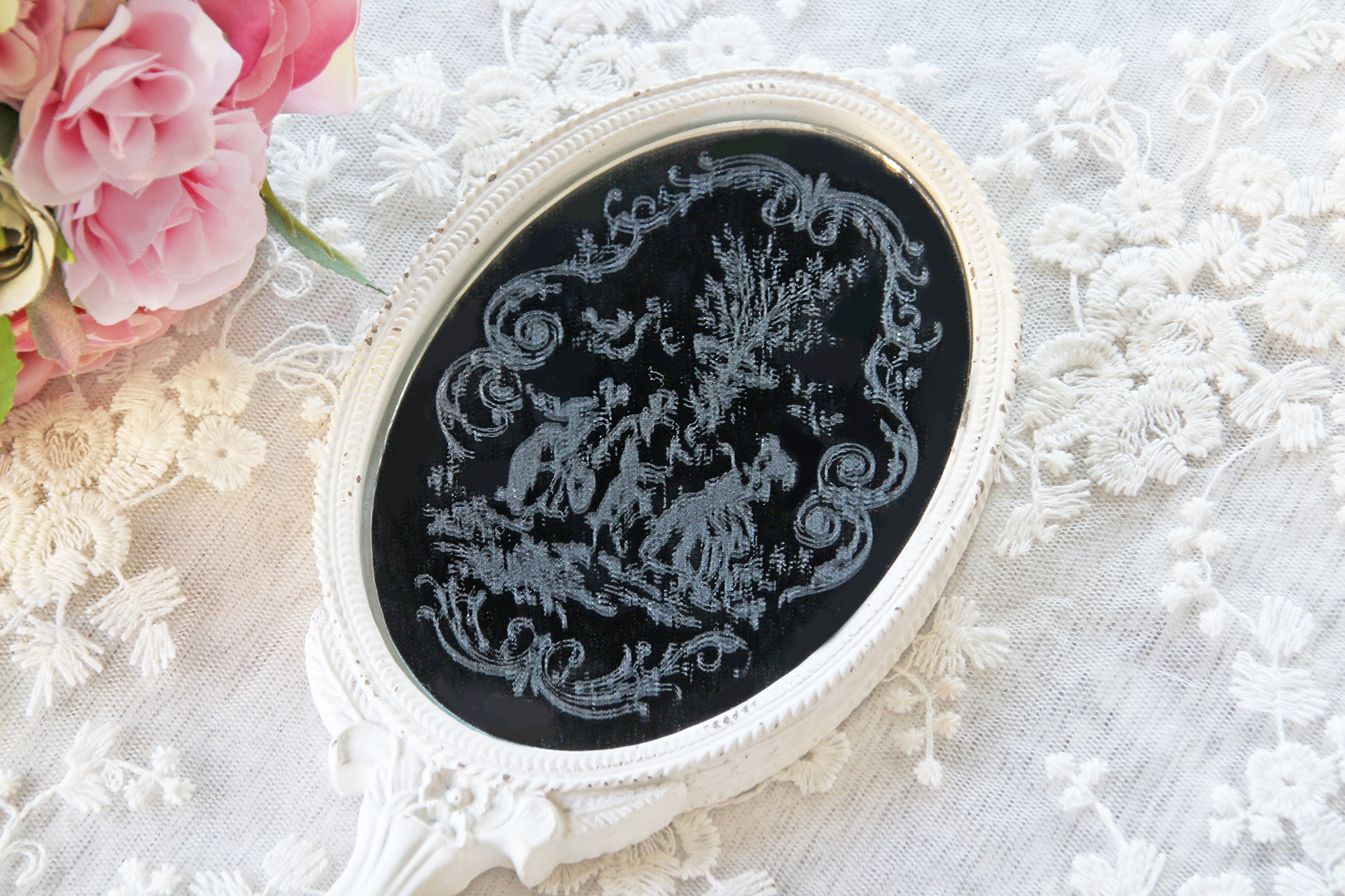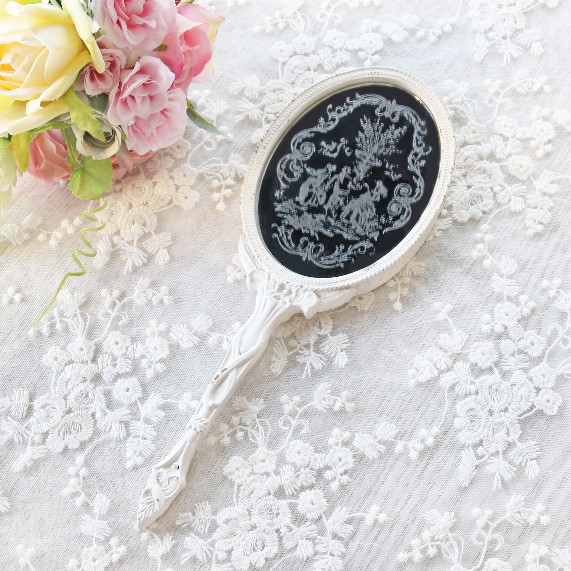 繊細な模様が幻想的に浮かび上がるリバーシブルのハンドミラーです。