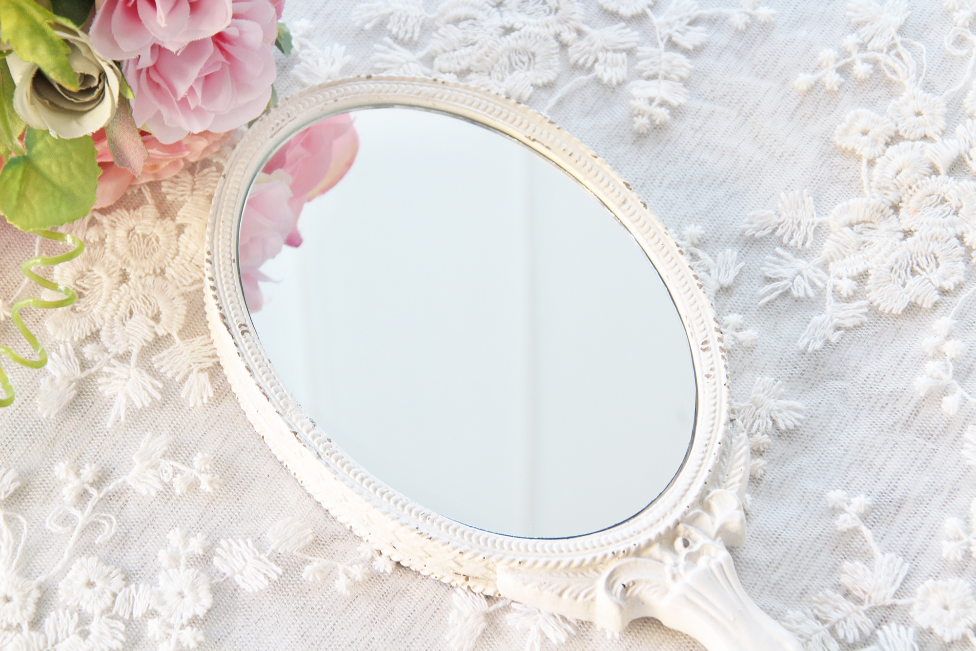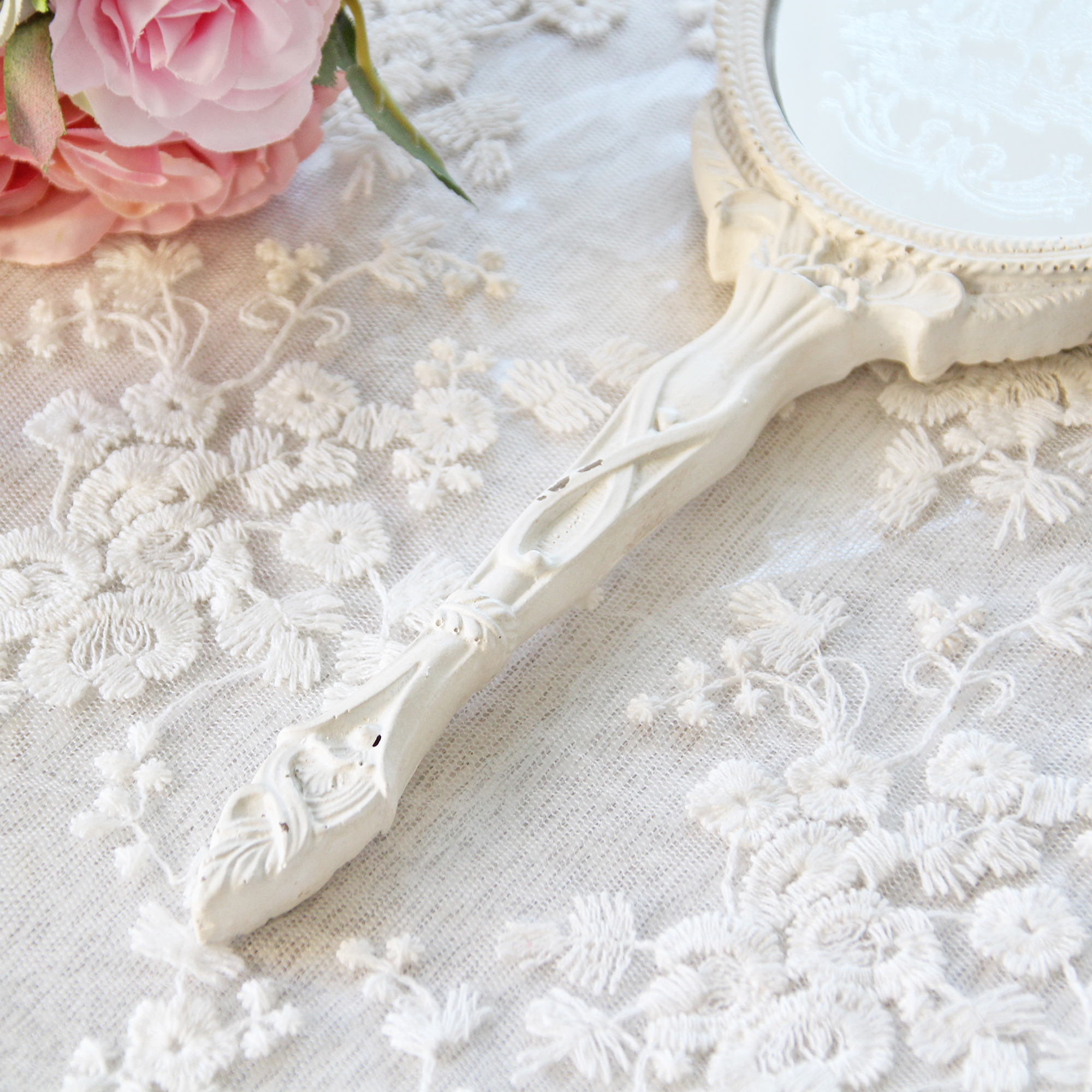 ミラーを縁取る柔らかく品のあるアンティークホワイトのフレームや持ち手には、立体感のある細やかなレリーフが施され、シャビーシックで上品な雰囲気を纏っています。