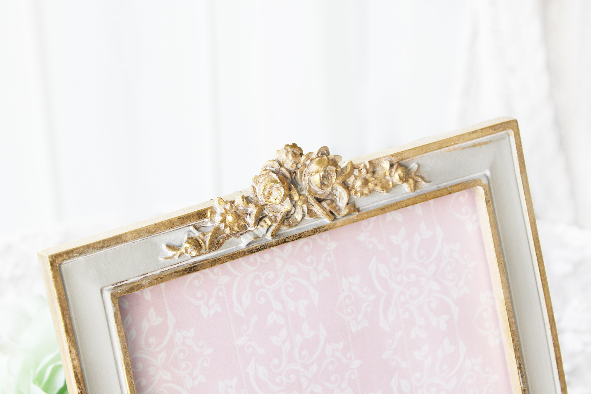 優しげなグレーのフォトフレームは、フレームを縁取るゴールドと立体的な薔薇がアクセントとなり、ほんのりクラシカルな雰囲気を纏ったアイテムです。シンプルで上品なデザインは、すっきりとした長方形で飾りやすく、中の写真を引き立ててくれます。