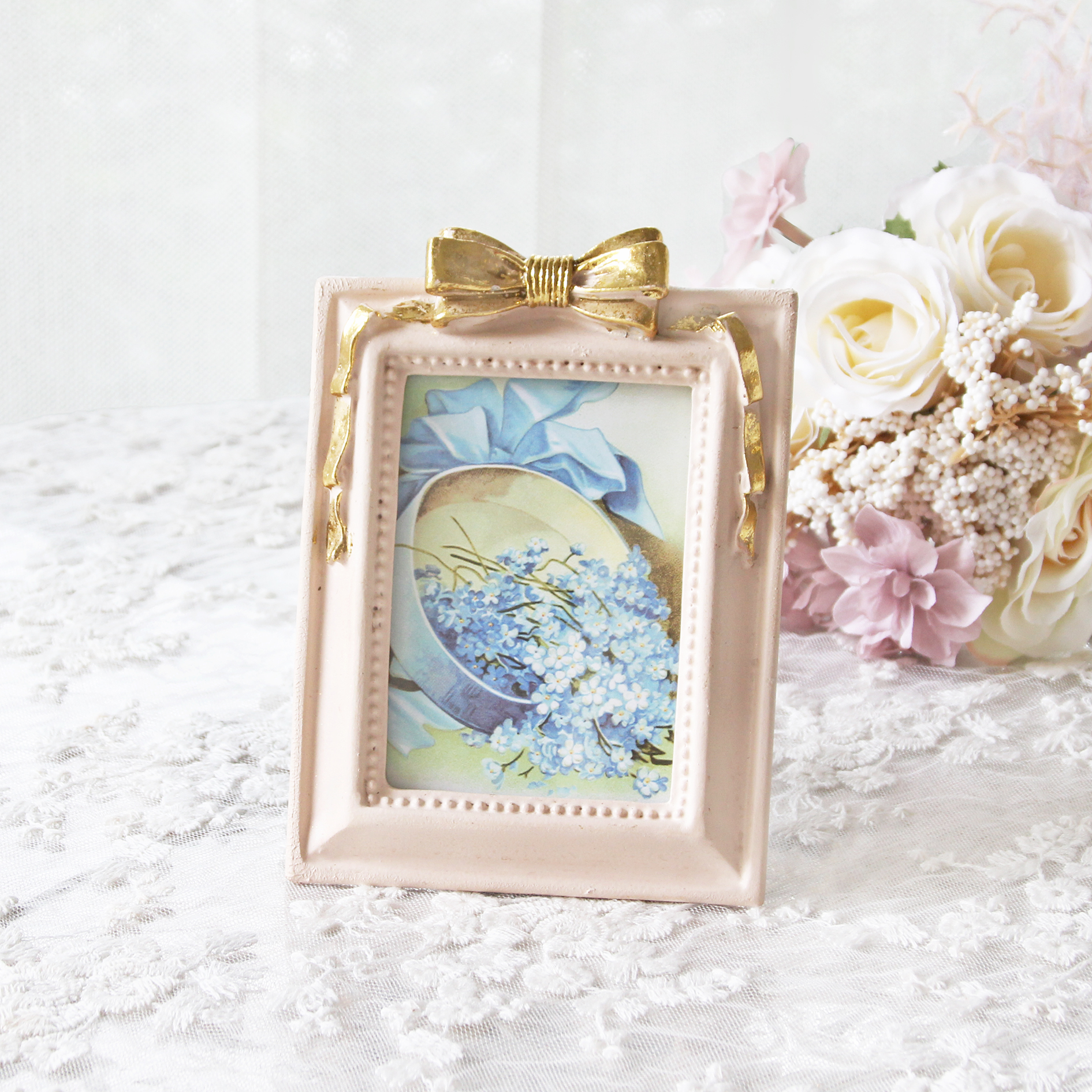名刺ほどのサイズの写真やカードにピッタリな長方形のフォトフレームです。柔らかいピンクと輝くゴールドの組み合わせは、甘さと上品さのバランスがとれた絶妙なデザインで、写真をより美しく飾ることができます。