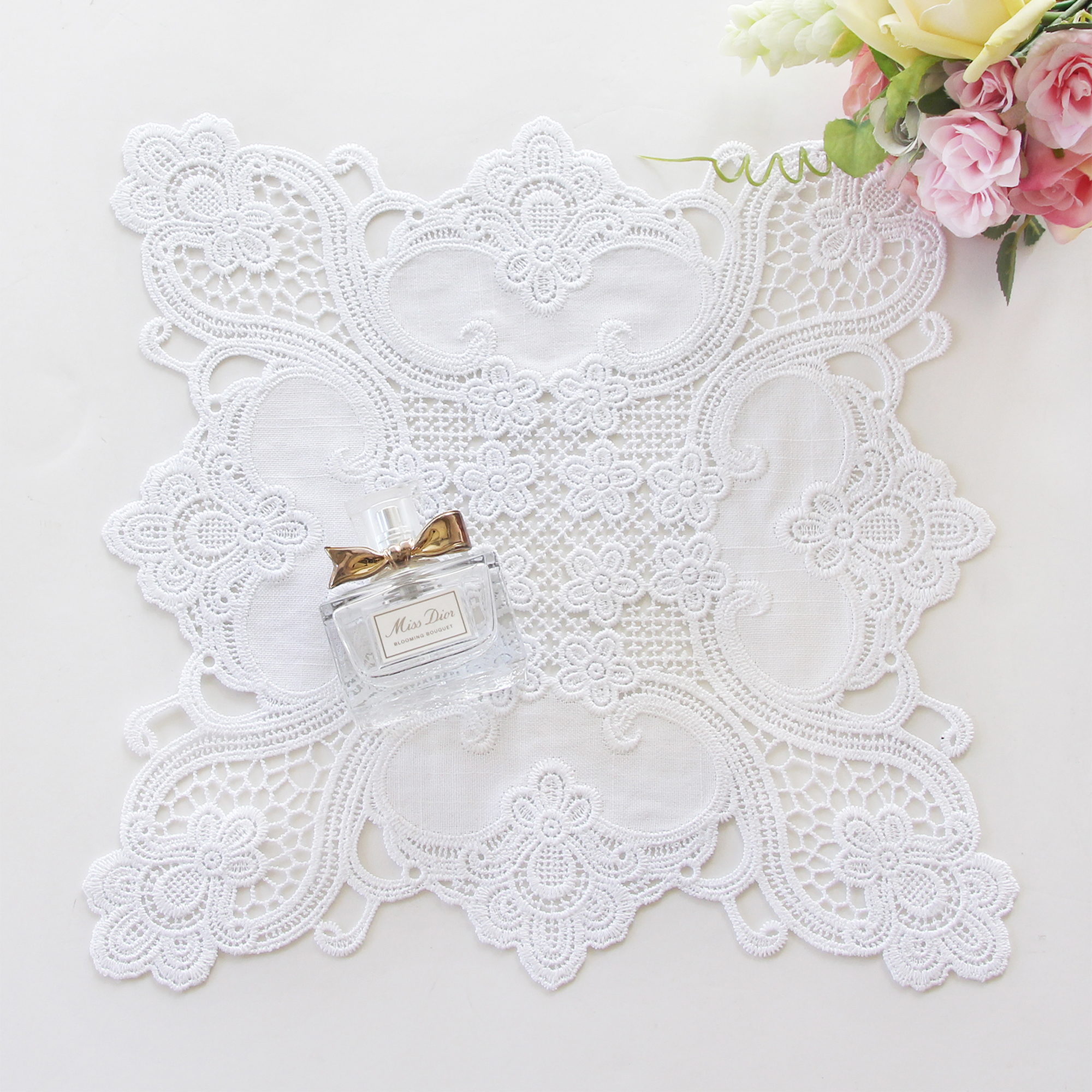 中央には可愛らしいお花の刺繍が並び、バランス良く施された美しい透かし模様がシックでフェミニンなデザインは、どこか可憐な雰囲気も併せ持っています。しっかりと厚みのある生地で扱いやすい正方形のドイリーは、角度を変えて自由な向きでお楽しみいただけます。