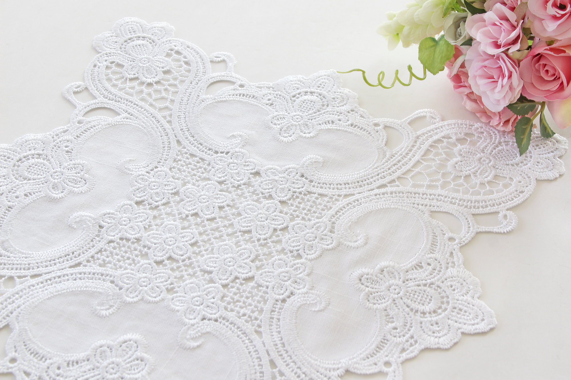 美しいカッティングが施された清潔感のあるホワイトカラーの生地に繊細な模様が広がる上品なドイリーは、花瓶やランプなどの下に置くのに丁度良いミニサイズで、空間に優雅さをプラスしてくれるアイテムです。