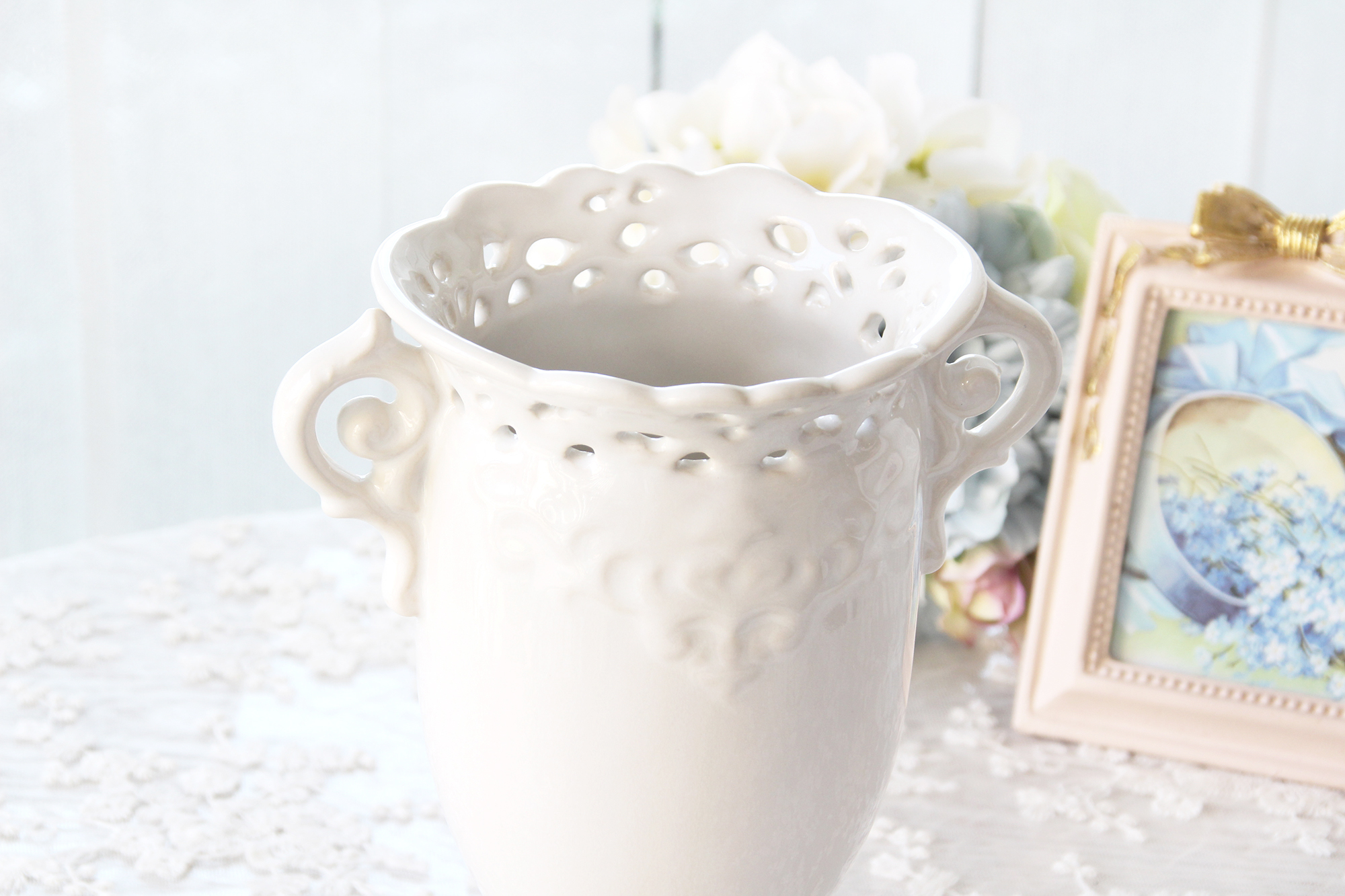 さりげない装飾が上品な、真っ白な陶器のフラワーベースです。