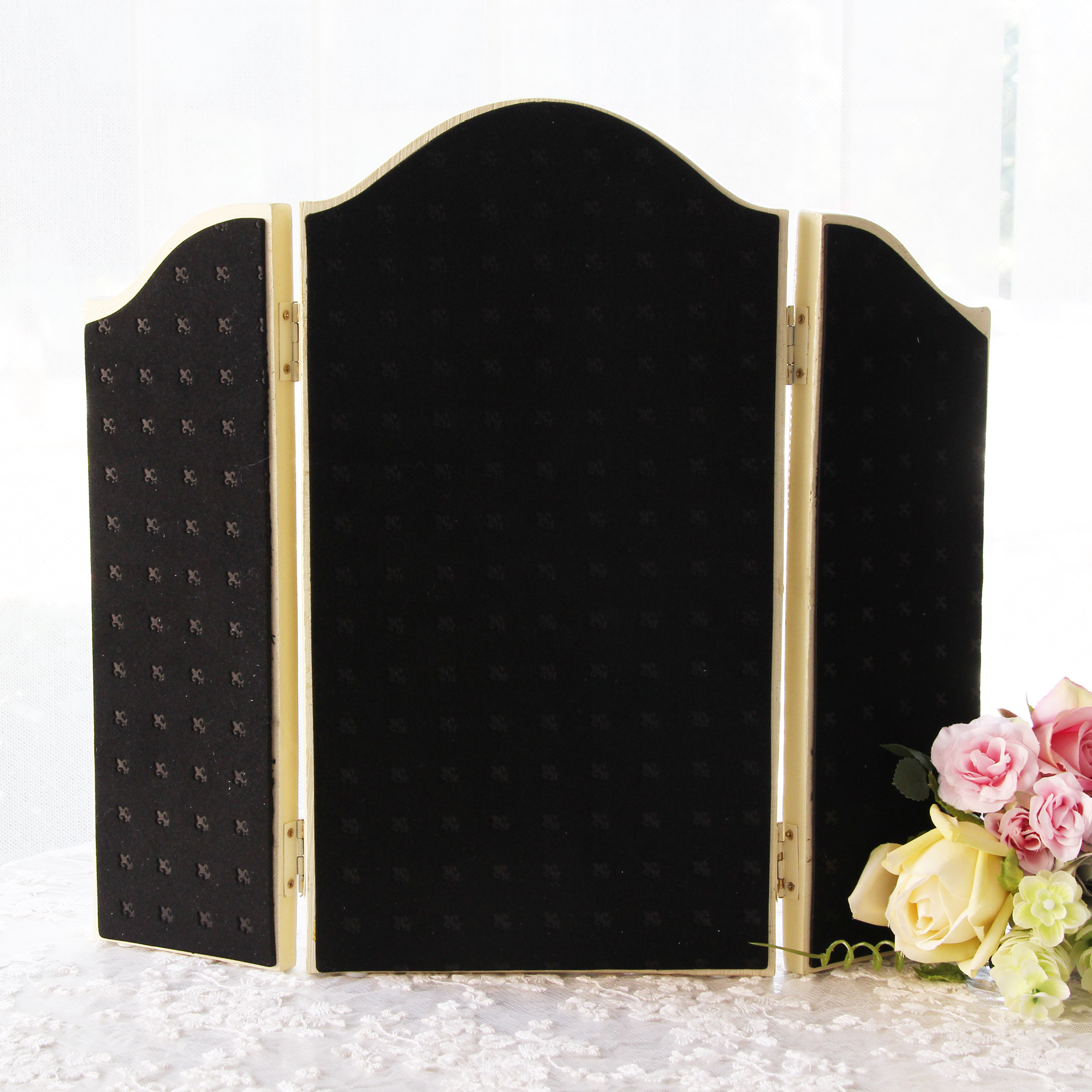 優しいアイボリーに高級感のあるゴールドの縁取りが目を惹く上品な三面鏡は、デスクやチェストの上に置いて、ミニドレッサーの様にお使いいただけるアイテムです。左右のミラーは角度が変えられるので、お好みで調節してお使いください。