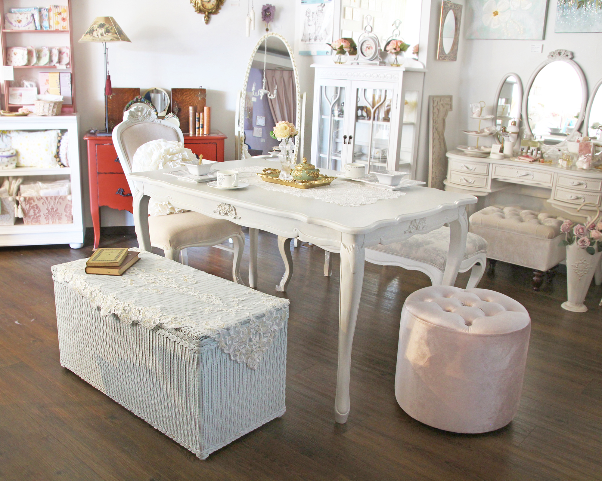 くるりとした猫足のデザインが可愛らしく、同じシリーズのShabby French Chairとご一緒に揃えれば美しく調和したダイニング空間をお作りいただけます。もちろんお手持ちのチェアや、異なる雰囲気のチェアをあえて置かれるなどしてアレンジをされても楽しいですね。